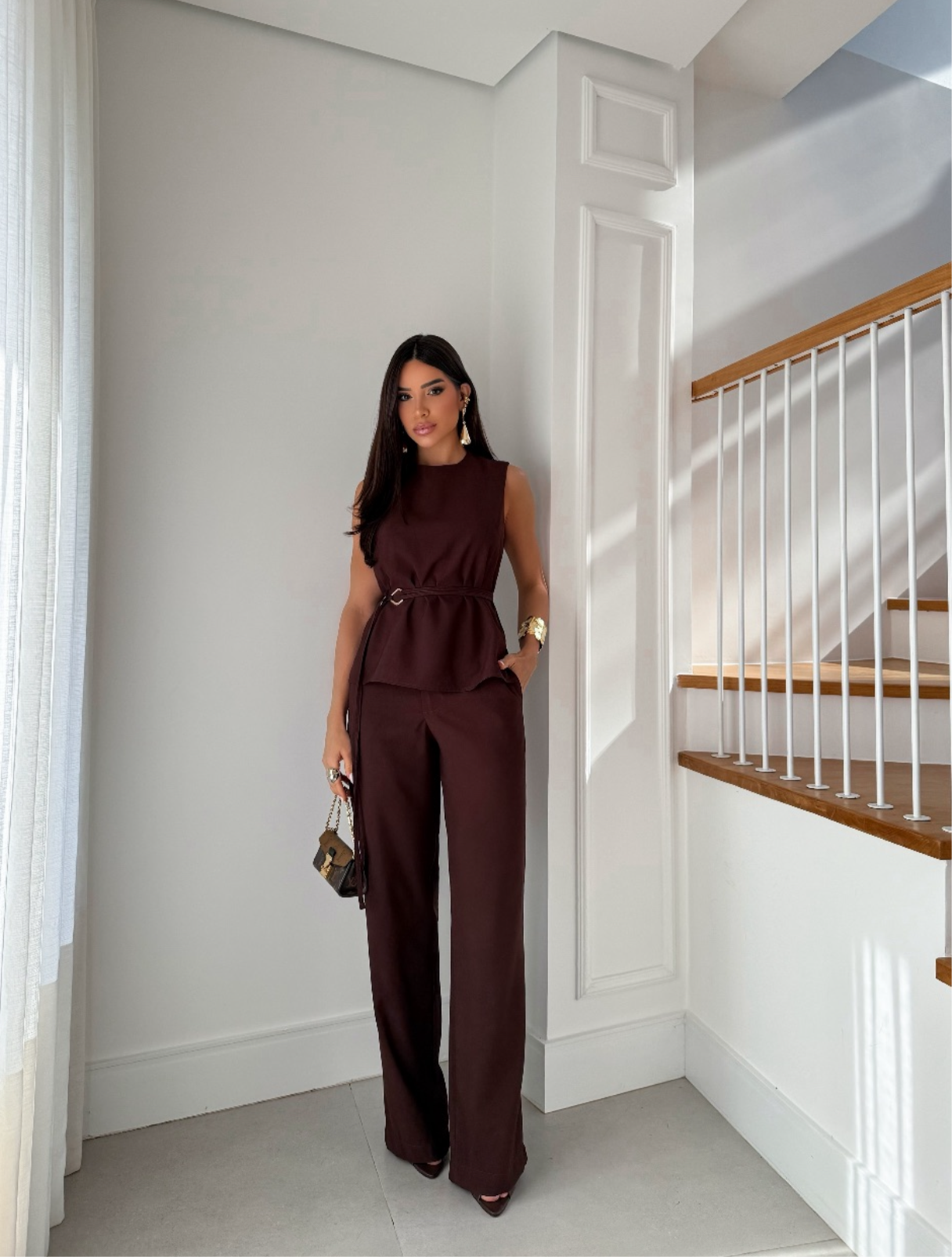 Elegância e sofisticação em cada detalhe! Blusa sem mangas com cinto no mesmo tecido e calça de alfaiataria com caimento impecável. Um look moderno e versátil para usar do dia à noite!