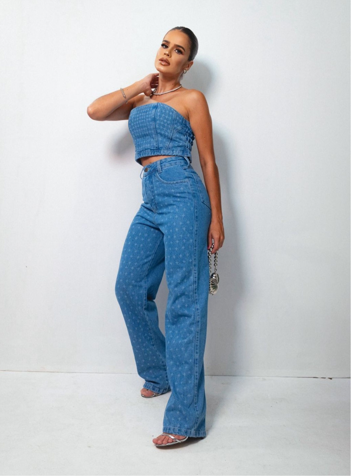 Conjunto jeans moderno com estampa de mini cruzes, composto por cropped tomara que caia estruturado e calça de cintura alta. Um look estiloso e marcante, perfeito pra quem quer conforto sem abrir mão do charme.